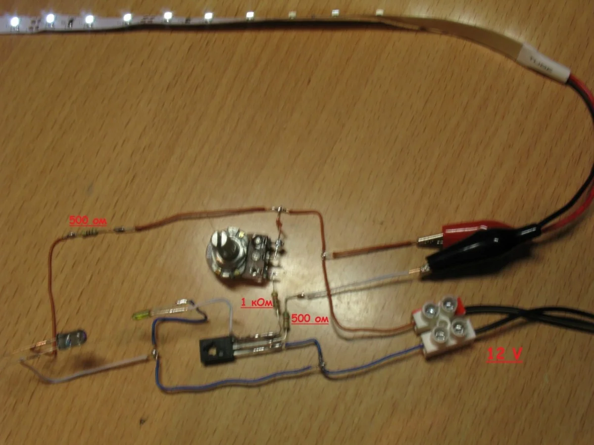 если у тебя светодиодная лента на 12 В, то резистор 500 Ом, идущий от коллектора транзистора к СД ленте не нужен, там в самой ленте уже должны стоять необходимые резисторы )))