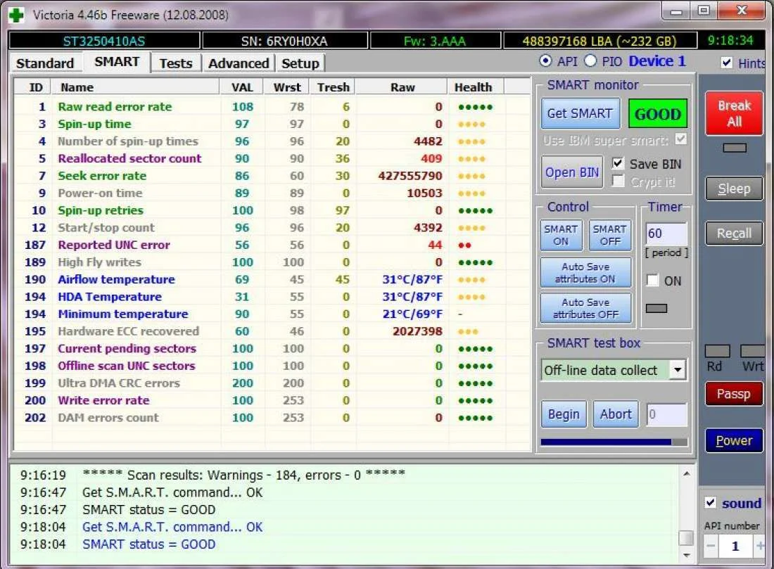 Впрочем хотелось бы еще взглянуть на а) на логи Victoria, б) как выглядит SMART после ваших упражнений с "чудо-прожкой"...