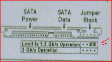 Джампер ограничивает скорость передачи до 1.5 gb\s, это было сделано для контроллеров 1-го поколения sata для совместимости. Ваша новая МП - sataIII, и не понимает лимит 1.5 gb\s, грубо говоря.