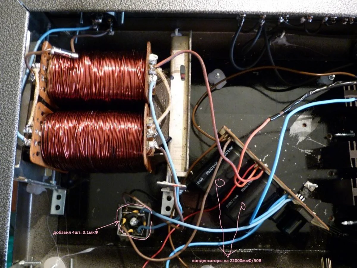 А так я сделал как Вы говорили. Убрал "лишние" конденсаторы. Оставил только вот как у Вас в усилителе. Больше ни чего нет. Питание идет только от диодного моста и этих двух конденсаторов 22000мкФ к двум усилителям.