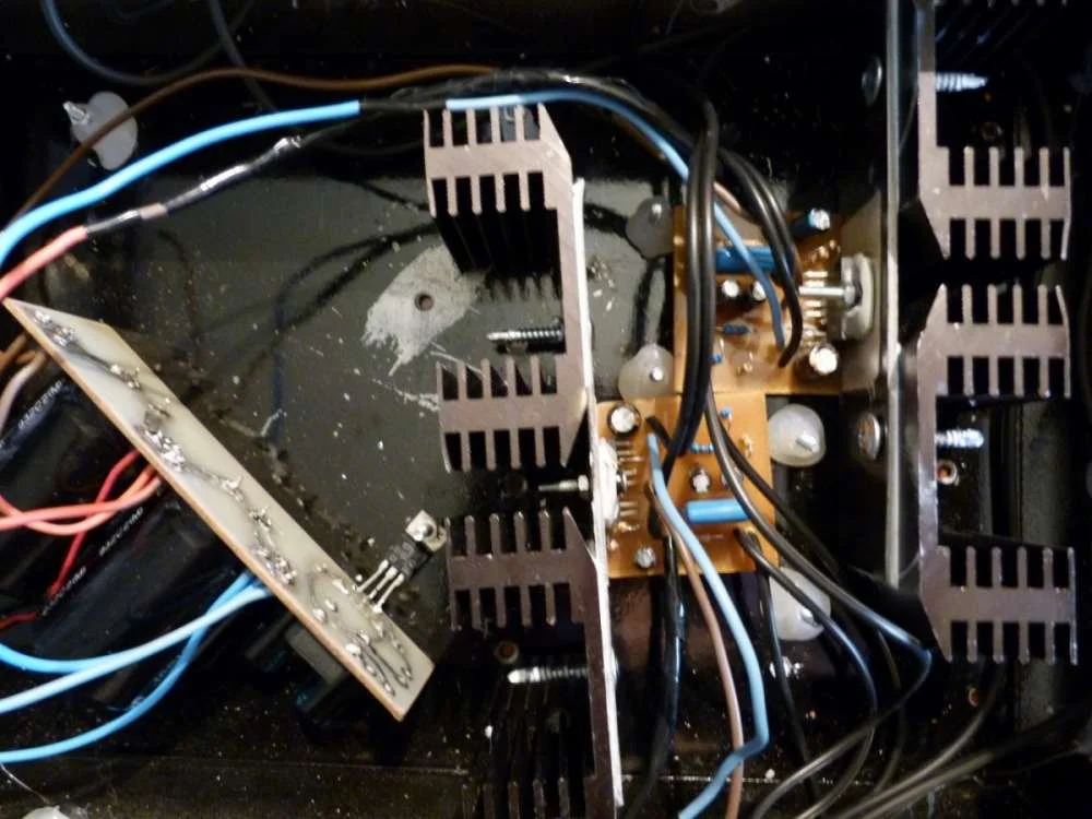 А по поводу нагрева, я обратил внимание на то, что микросхемы у тебя прикручены к очень тонкой пластине, судя по фотографии, её толщина не более трёх миллиметров, а этого недостаточно для быстрого отвода и распределения тепла.