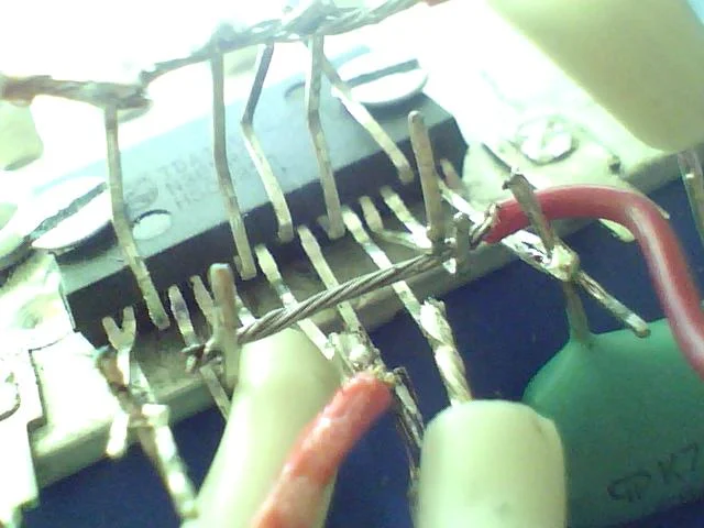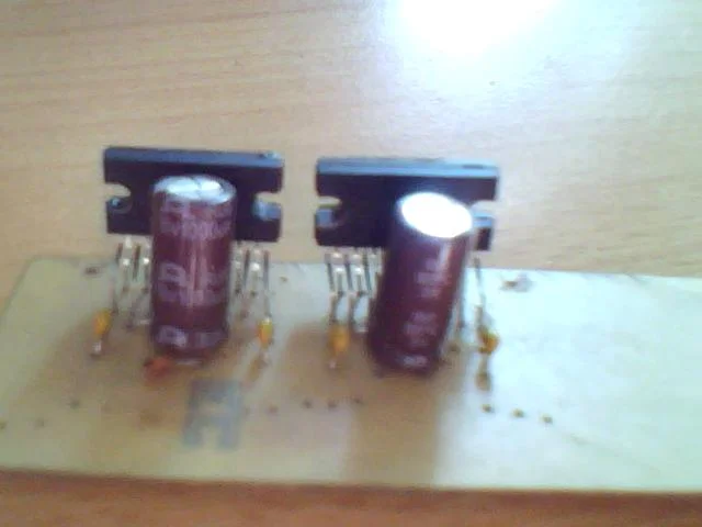 нет не греется только при включении щелчок и все а еще одна тда вроде рабочая я ее присоединил к колонке звук подал от мпхи и скозь щипение я услышал музыку но токо на один канал я ща схемку выпаял буду пробовать навесом за вото не бейте делал с вэбки