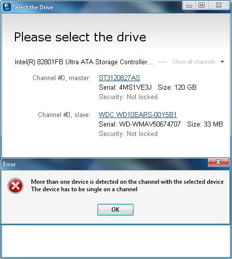Это сообщение появляется при выборе винчестера? Вряд ли 1Tb винт IDE. Пробуйте нажать ОК и выбрать ваш проблемный винт.По вашему совету не получается выходит вот такая ошибка!!