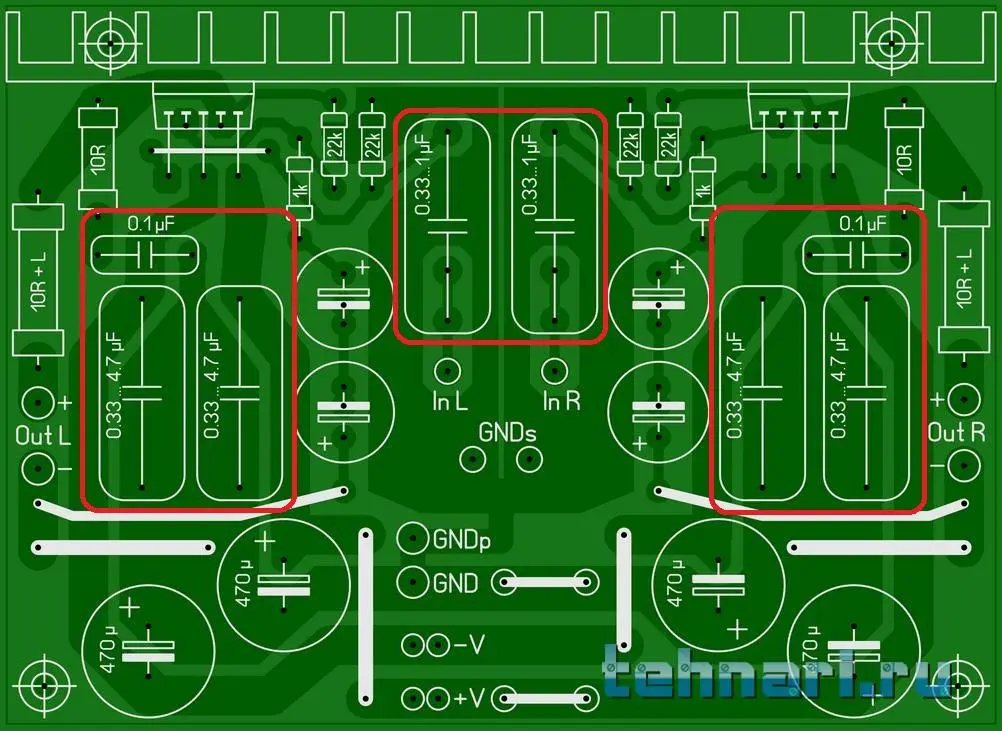думаю вместо навесного монтажа сделать , вот так . конденсаторы на C1, C2, C3, C4, C9, C10 хочу поставить по 0,68 мкф ,а С5 и С7 поставить 10000 мкф на 50 вольт . как вы думаете ?