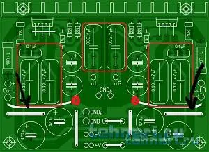 фон говоришь есть !щас только заметил что земля неправильно разведена!!! под парами кондюков которые по 0.33-4.7мкф есть по две горизонтальных перемычки-удали верхние длинные а точки их пайки которые ближе к центру платы соедини каплей припоя с землёи входов-ну это к которой оплётка входных проводов припаяна .так будет правильно и дай бог фон исчезнет