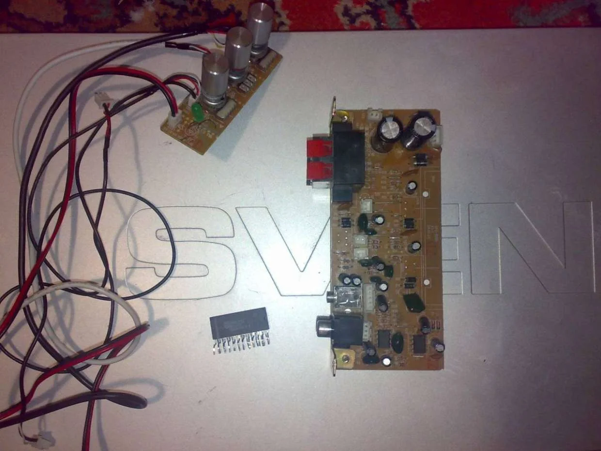 землю можешь из другого места взять, я тут тебе её показал так для наглядности, землю подкидывай на землю собранного уся (провод кинь с минуса этой платы на минус своего усилителя который соберешь). единственное что, придется в любом случае запитывать эту свен, чтоб заработали фильтра. громкость будешь регулировать через ее регуляторы.