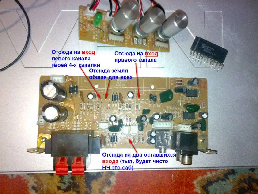 смотри, у тебя есть плата от свена ты писал выше. так? на ней было 3 TDA2030 так? вот там две мс берут сигнал (вход) через СЧ фильтры (правый левый канал сателлиты) и один канал через НЧ это сабвуфер. если тебе надо сделать 2.1(2.2) ситему, то нужно подать на два входа твоей 4канальной мс звук через сч фильтра, а два других через нч фильтр.