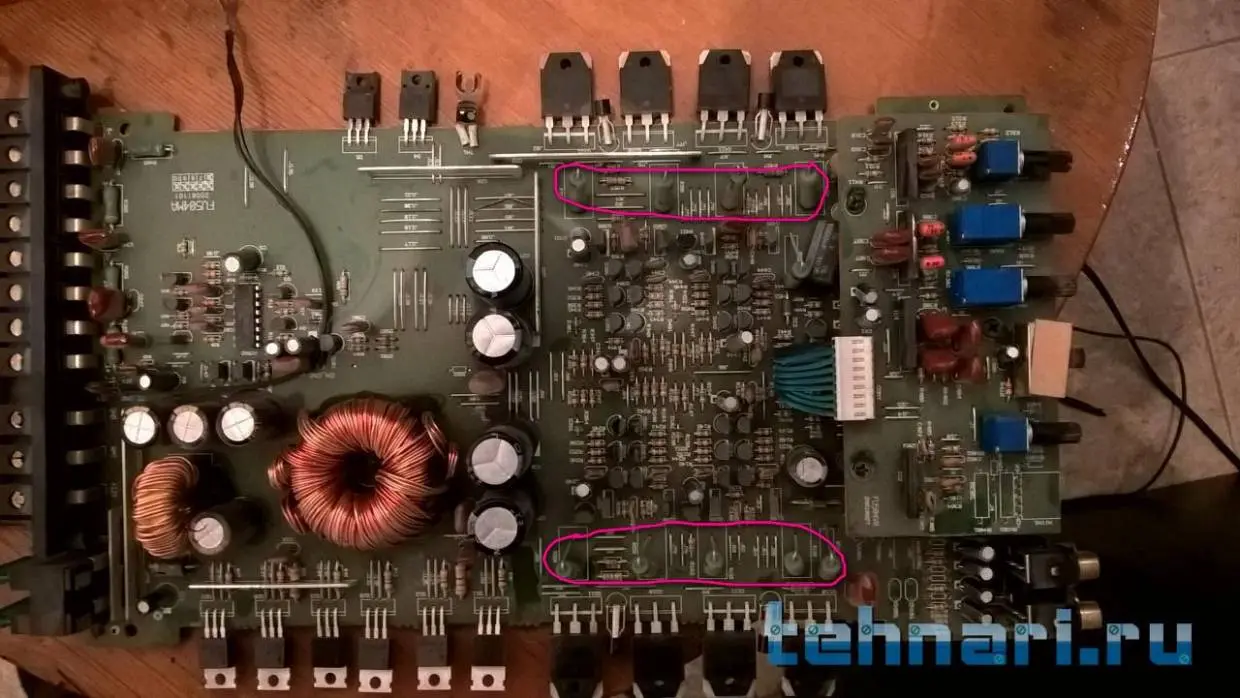 черный щуп воткнул в минус питания а красный на резисторы . то сторона где транзисторы холодные там 0.05вольт везде а на другой стороне 0.15в где то еще и 0.38в . и крайные транзисторы греются