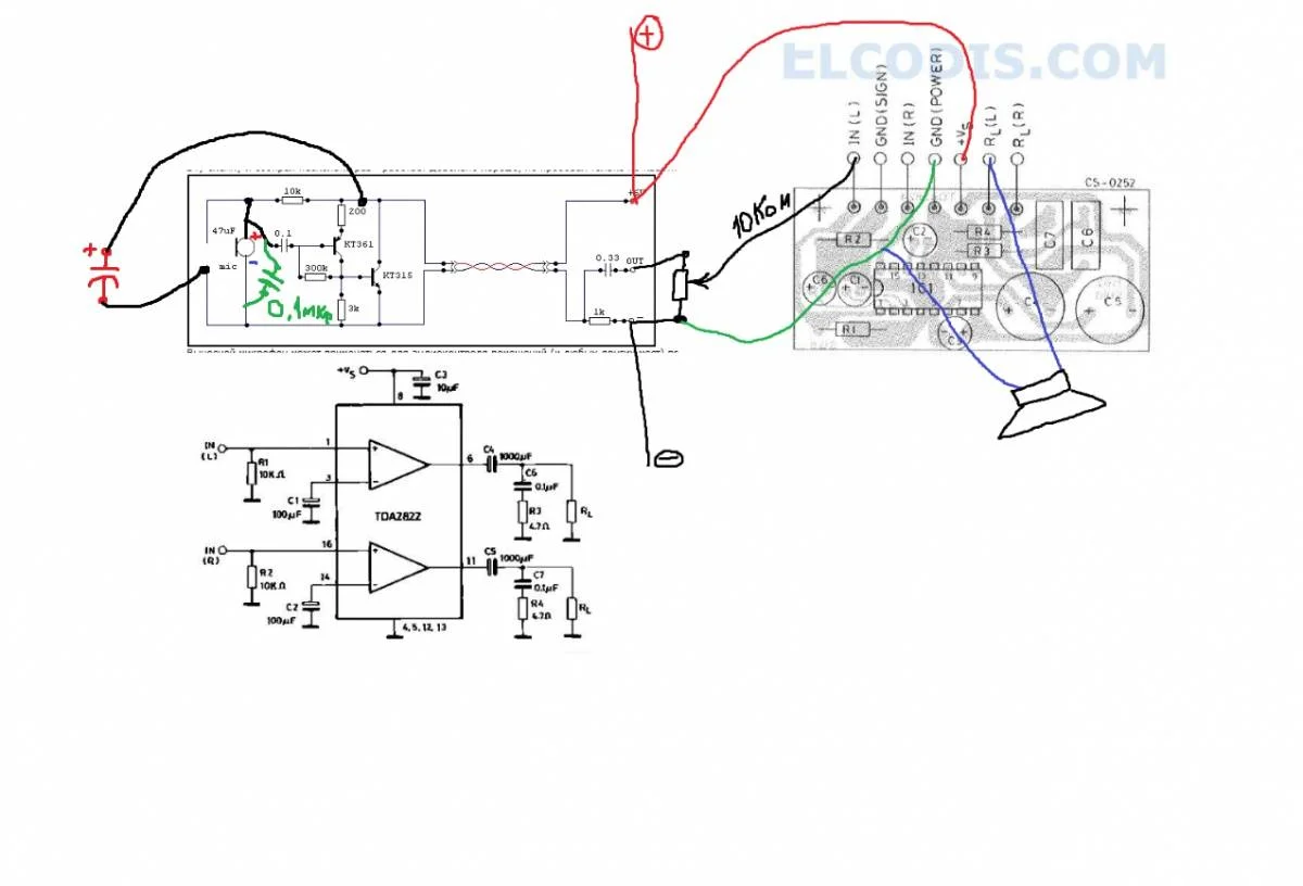 Здравствуйте. Я собрал "электронное ухо" по схеме Электронное ухо - Предварительные усилители - Усилители НЧ и все к ним - [Каталог статей] ,подключил, но ничего не произошло....Потом я узнал что надо поставить усилитель (я использовал ТДА2822 16dip), подключал по всякому; 1) из динамика идут гудки (как будто идет вызов по телефону), 2) ничего не происходит...... Усилок на 100% рабочий--- на 2 канала стерео....Не могли бы вы помочь подключить усилок ТДА2822 к плате "электронного уха"??? P.S.: если можно покажите схематично на фотках (через paint).......Заранее благодарен!!!!