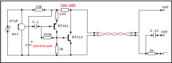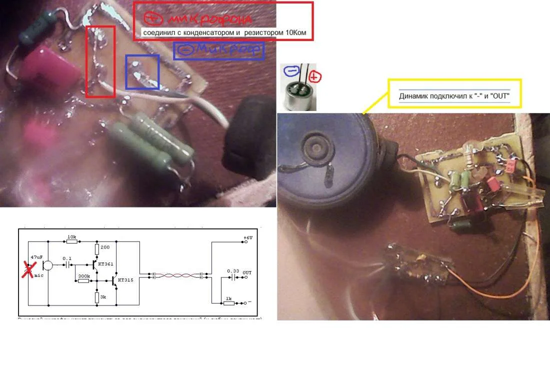 Поставил +кондера 47мкф в точке 200, 10ком и коллектора кт315,,,,а минус поставил там где он должен быть на схеме..... заработало,,,,,(только еле еле слышно) при кручении переменника звук можно прибавить или убавить,,,,, но очень тихо слышно. В чем может быть дело????как увеличить громкость? может переменник побольше взять??? (еще: поставил параллельно микрофону кондер 0,1мкф от минуса к плюсу что бы шума меньше было)