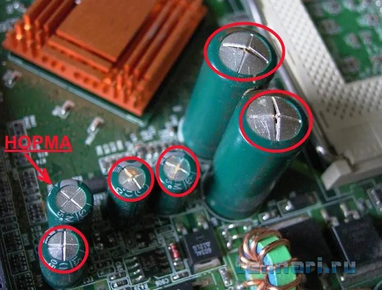 верх кондера должен быть ровным, или даже чуть вдавленным внутрь, если даже чуть вспух - под замену. И не пытайтесь у вспухшего кондера верхушку обратно затолкать - только хуже сделаете.