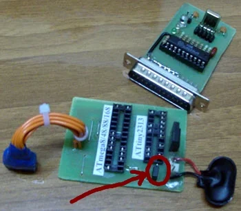 В третьих, это джампер, перемычка то бишь. С её помощью к программатору подключается или 2й или 8й вывод программируемого контроллера ATtiny2313. Зачем? Сие мне неведомо.