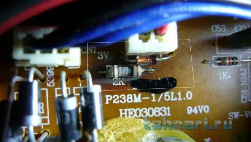 В последнее время при громкости примерно на 45% пропадали периодически басы на сабвуфере (сателлиты играют). А недавно и вовсе сабвуфер перестал выдавать низкие частоты, только идет небольшой гул + гул из сателитов (сами сателиты звук воспроизводят). После разбирания системы на плате было обнаружено место где сопротивление было обуглено. В других местах ничего не было, ни налетов, ни нагаров, ни надутых конденсаторов. Подскажите в нем ли проблема. Если да, то на какое заменить, не могу разобрать маркировку. Спасибо.