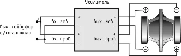 Мне не нужна схема трехполосной аудиосистемы, мне нужно подключить сабвуфер с изобарически соединенными динамиками к усилителю автомагнитолы "А" от линейного выхода на сабвуфер магнитолы "Б", причем моносигнал сабвуфера я хочу развести на два канала усилителя магнитолы "А", а потом усиленный сигнал каждого канала подвести на два разных динамика. На схемке мой замысел отражен в полном объеме. Меня беспокоит соединение между магнитолами "А" и "Б" - не будет ли какого нибудь аппаратного косяка.Почитайте здесь AC CO СДВОЕННОЙ ГОЛОВКОЙ