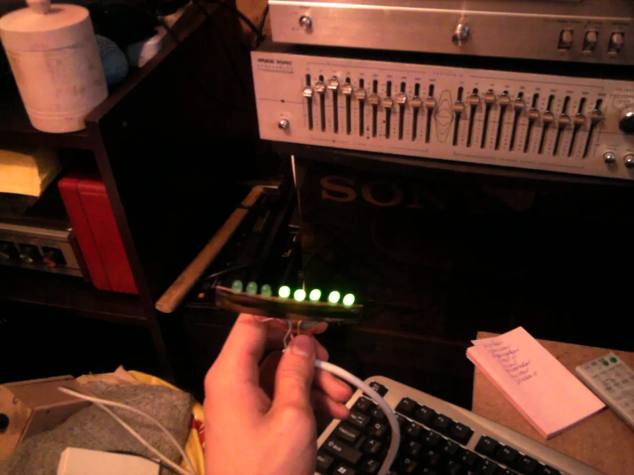 может попробовать усилить сигнал транзистором кт 315))) на каждый светодиод свой транзистор))) а может быть даже по несколько светодиодов)) у меня созрела одна идейка о полноценном спектроанализаторе- а что если сделать 5 блоков по 10 светодиодов и между каждым блоком каждого светодиода поставить резистор нп в 1 кОм. слабый сигнал до конца не дойдет а более сильный дойдет)))) правда понадобится много резисторов))))