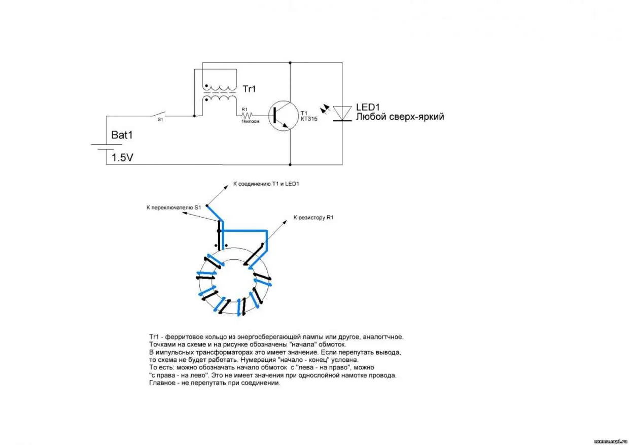 кольцо для трансформатора можно взять от лампы энергосберегайки.А провод от не еже.Мотайте плотнее витки и не перепутайте где начало и конец а то не будет работать.