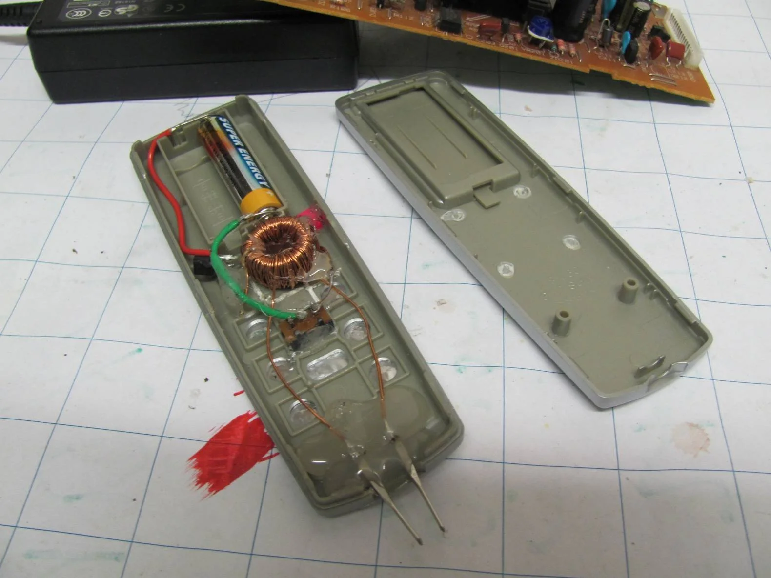 Далее поключаем к нагрузочной обмотке электролит 10-15 мкФ и количеством ее витков и их расположением на кольце добиваемся заметного снижения яркости свечения светодиода. При емкости электролита 500 Мкф и больше светодиод должен гаснуть совсем. Все.