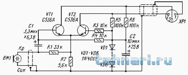 Приведённая в качестве примера схема предназначена для емкостных микрофонов с питанием 48 В. Вам нужна будет переделка.