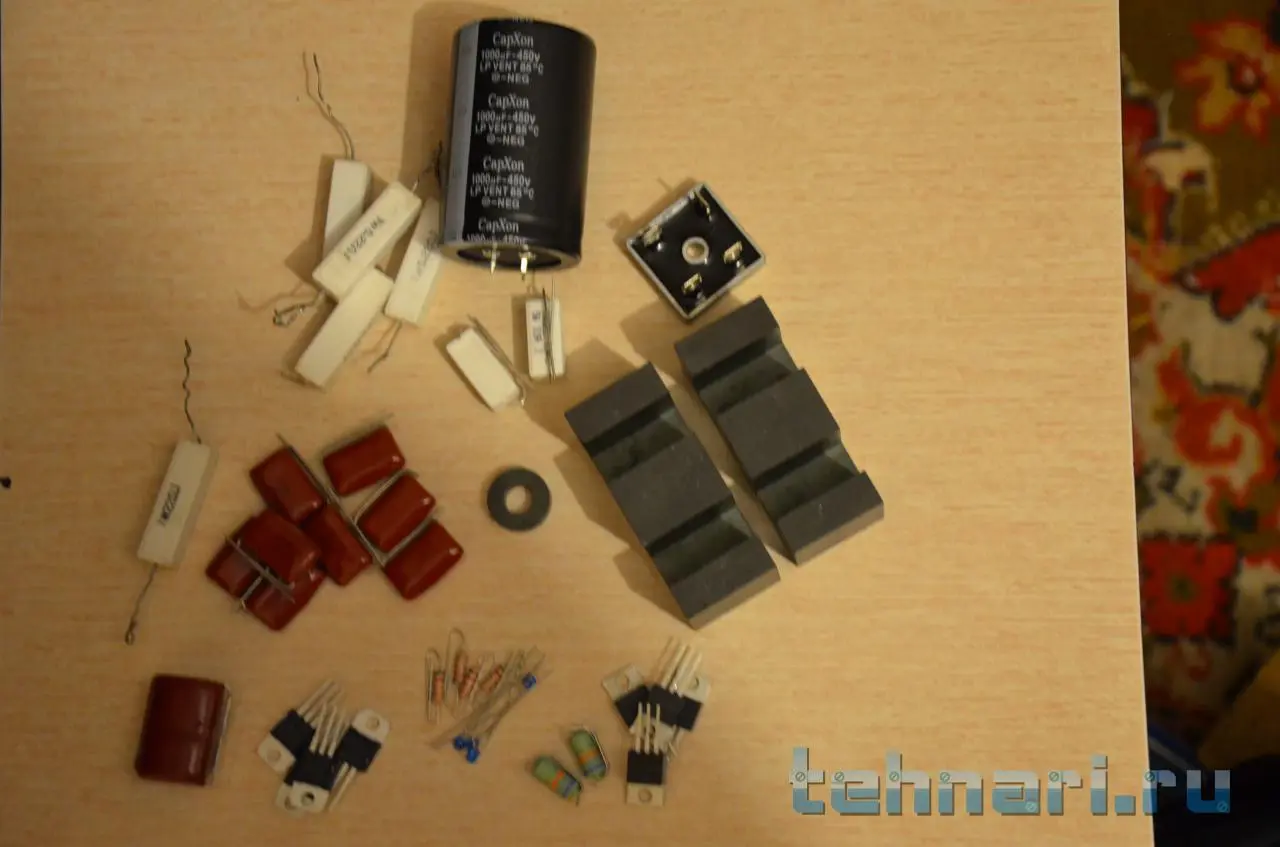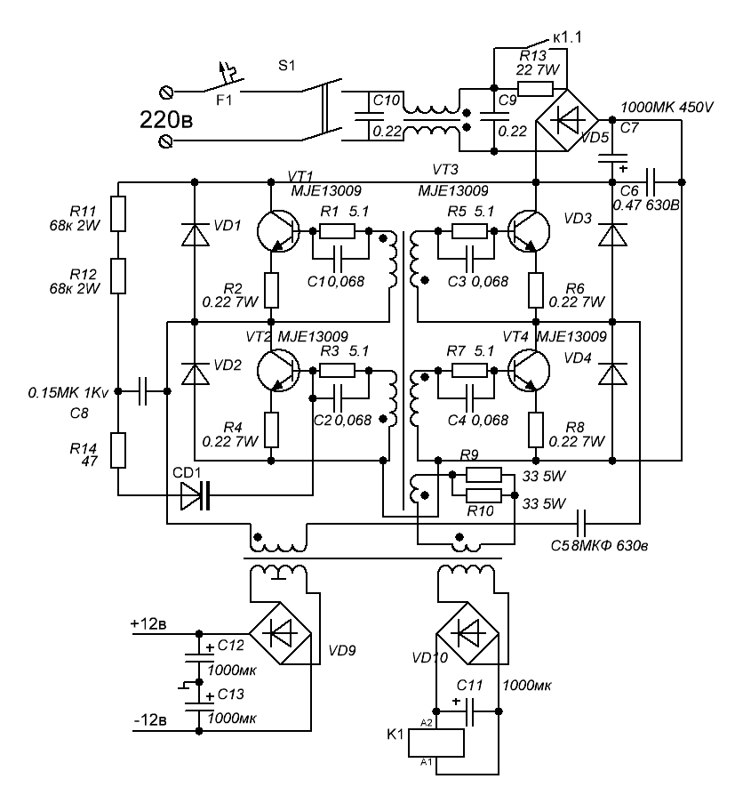 Все часто я встречал в инете схему "Простой автогенераторный ИИП мощностью 1,5 кВт для УМЗЧ" но не видел чтоб ктонибуть ее собирал,видел на этом сайте хотели собрать,но руки не дошли или кто то собрал,но ничего не заработало так вот после сборки прошлого проекта решил взятся за этот,так как вроде я имею хороший опыт по построению подобных автогенераторов.Схему смотрел здесь http://www.diagram.com.ua/list/power/power422.shtml так вот нужна помощь на счет диодов 5-8 есть какиенибудь аналоги подойдут например фр607 на счет транзисторов под кт812 у меня нет радиаторов и стоят они под 100 рублей гдето решил взять 4 шт мже13009 стоят всего 50р вроде 12 ампер тянут ток как 2 кт812 и рессеивают больше и еще можно сделать мяхкий пуск как на моей схеме???и резисторы не 0.1 а 0.22 в магазе нет их.Некоторые детали я собрал но нету кн102 можно ли заменить из энергосберегалки???