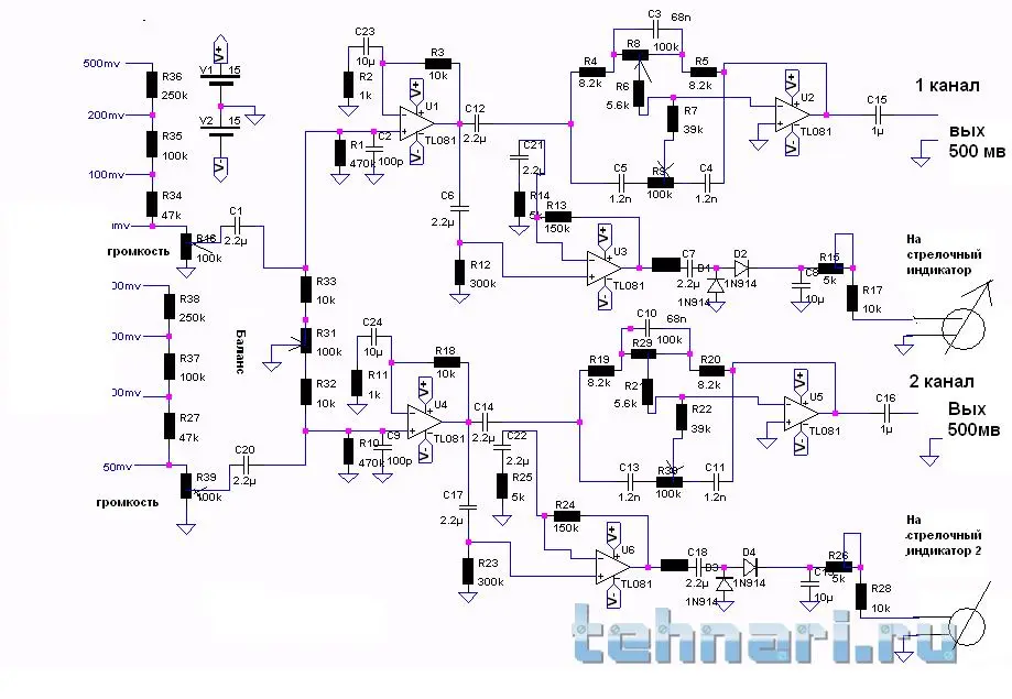 Вполне годная, только я бы сразу делал и и индикатор и регулятор тембра. Вот, я буду джелать такую схему. Схема на панельках, то на операционники не обращайте внимание, будут стоять в звуковом канале другие, на индикатор можно и TL0811 и 8 это мы знаем))) интересовала обвязка на 2 и 3 ноге. годная или нет..