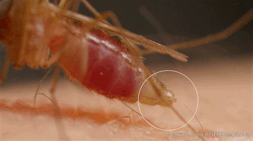 Когда самка комара готовится сделать укус, ее «губы» (гибкий чехол для кусающего органа — лабиум) отходят назад, и в кожу вонзаются шесть похожих на иглы «лезвий» (максилл).