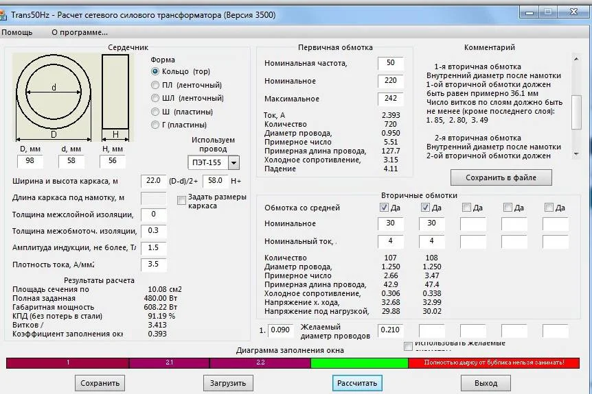 ну почти все верно,только плотность тока поменьше конечно,да и еще края очень острые придется обработать,чтоб не резало проводник.Специалисты, нужна снова ваша помощь. Нашел железо ТОР, буду учиться мотать трансформатор. Посмотрите пожалуйста верны ли расчеты в программе?