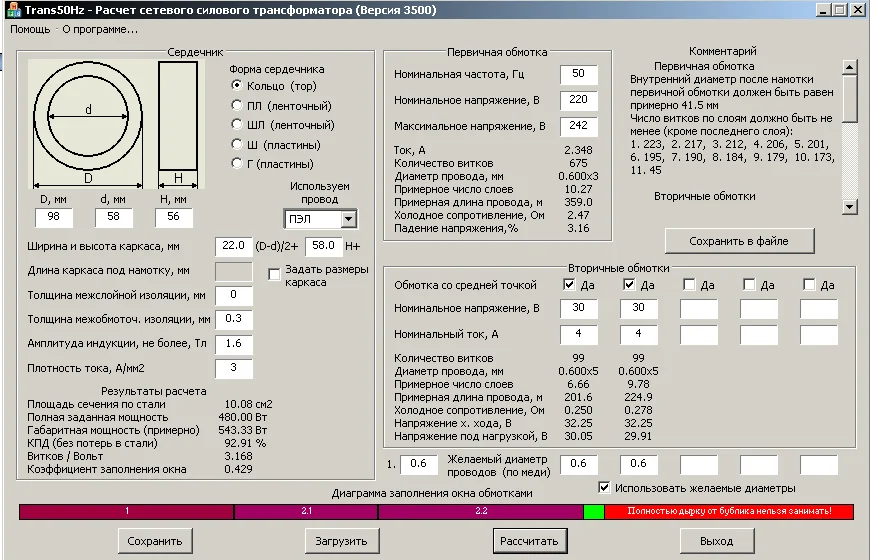 Ставим галочку и вводим диаметры проводов имеющихся в наличии. При использовании провода Ф0.6, первичку необходимо мотать в три нитки.