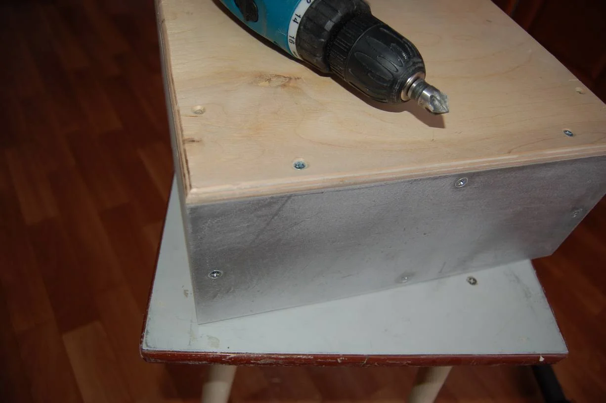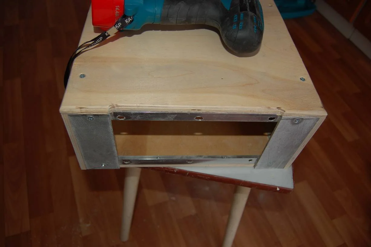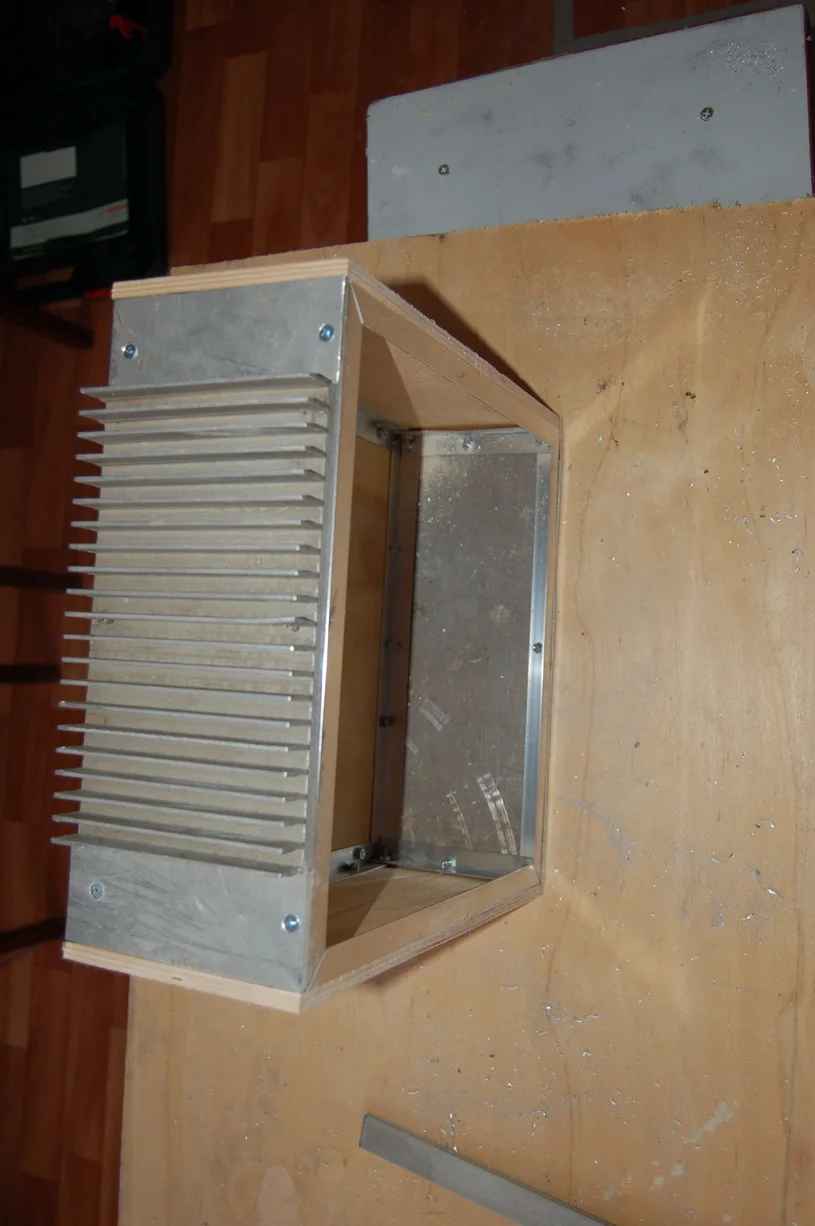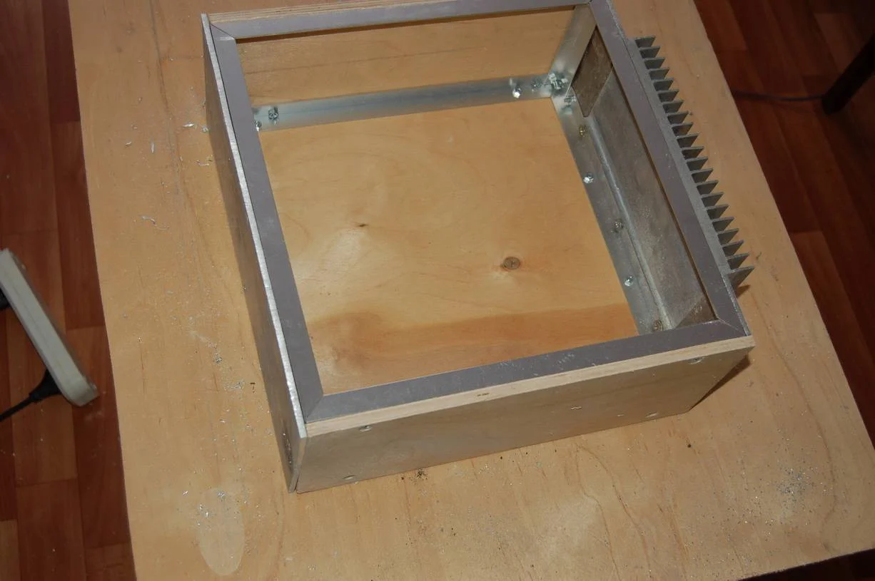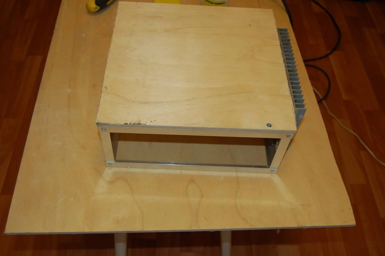 Пока корпус саба сохнет , вернулся к корпусу для усилителя. Возникла небольшая заминка в связки с материалам для него. Драгоценный люминий израсходовался на стереоусилитель TDA7294 который у меня в дневнике. Остался лишь небольшой кусочек для лицевой панели, и больше найти не мог нигде листового металла. А покупать за 4 т.р лист люминия 1,5х3м в магазине как то не очень. Вот и принял решение стенки сделать из 8мм фанеры которая у меня осталась после ремонта квартиры. В принципе все равно все будет тщательно обрабатываться наждачкой, шпаклеваться, грунтоваться и краситься, рука уже набилась на этом процессе)) Верхнюю кромку быстренько оббежал ручным фрезером, потом при работе со шпатлевкой выведу изгиб более тщательно
