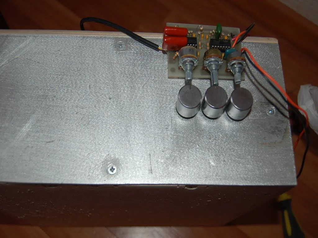 Корпус покрашу черным металликом в цвет саба ну и примерно такой вид будет. 3 регулятора фильтра и кнопка включения слева