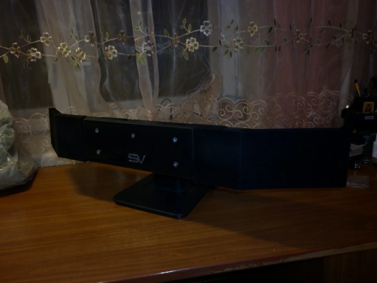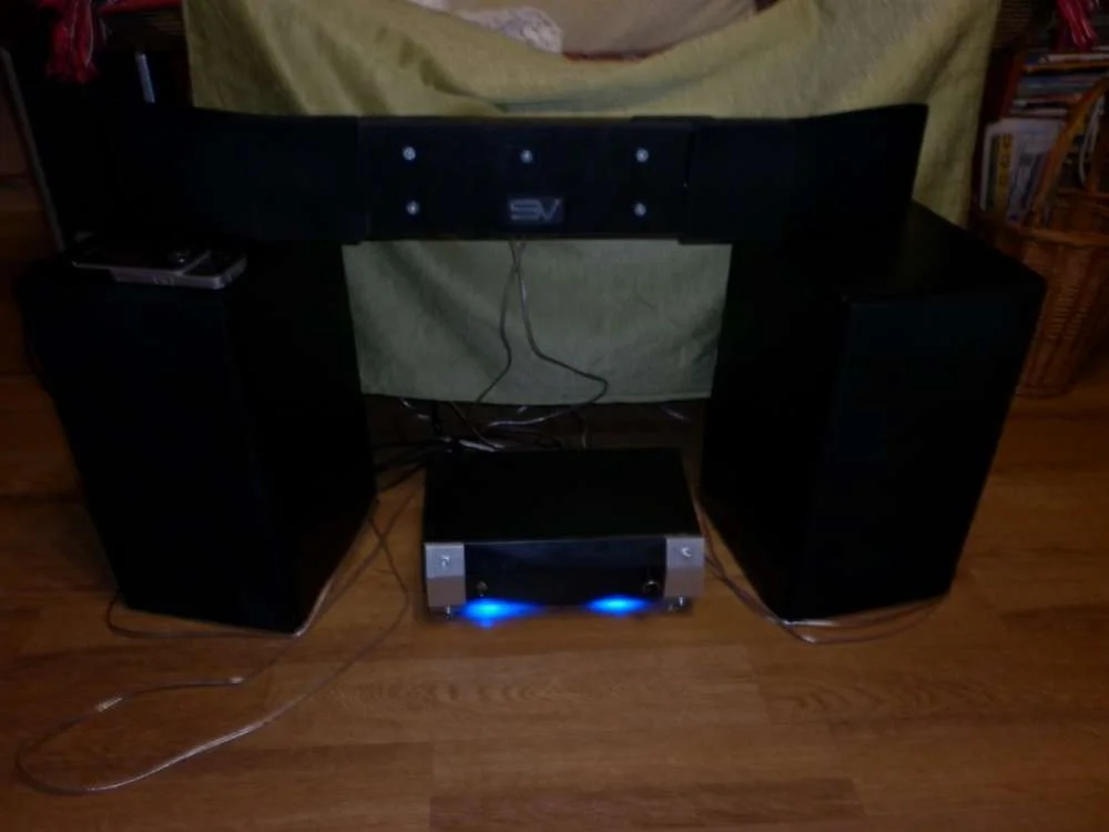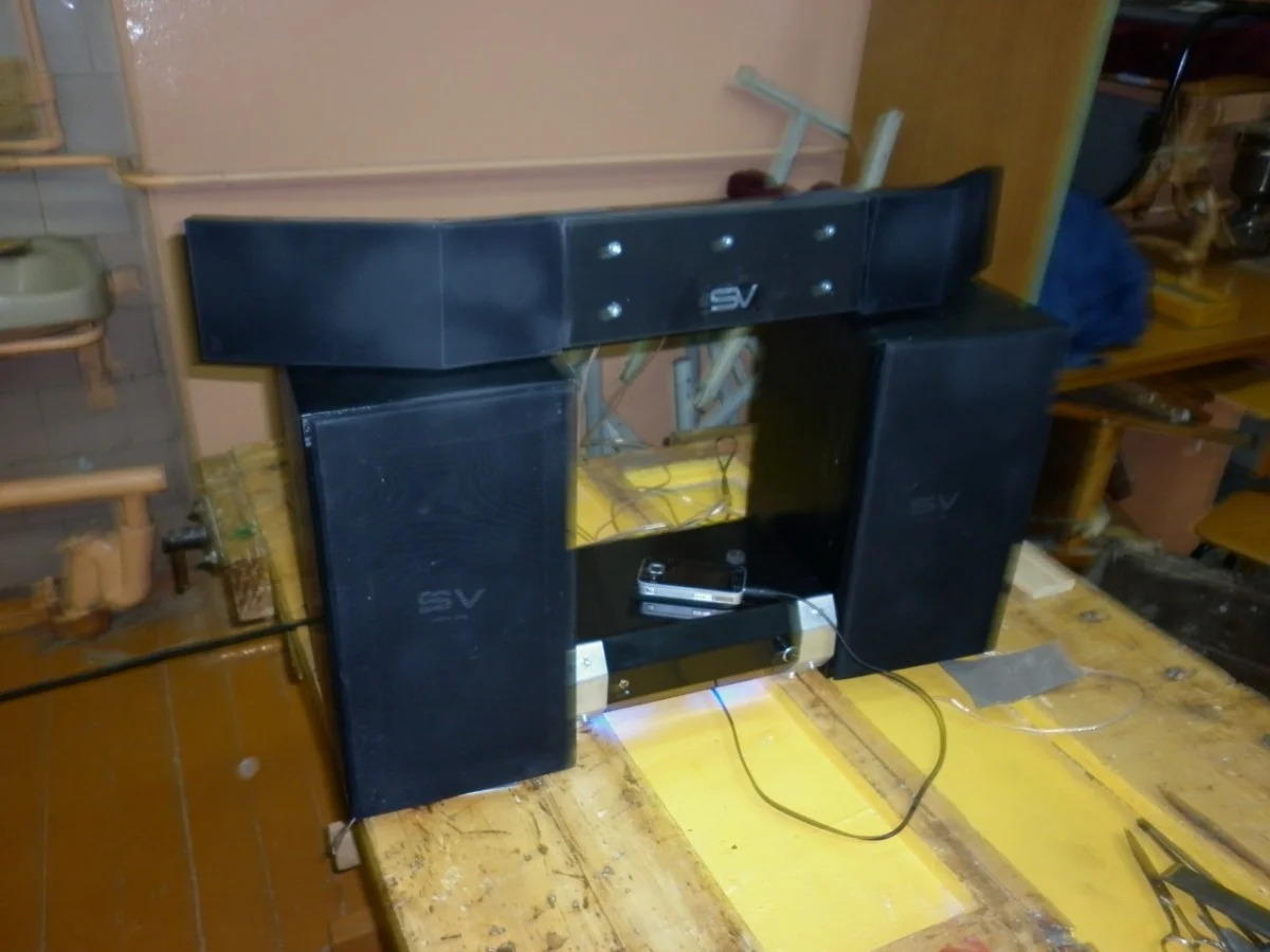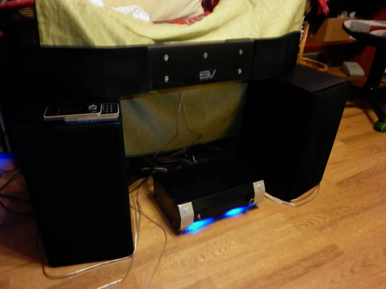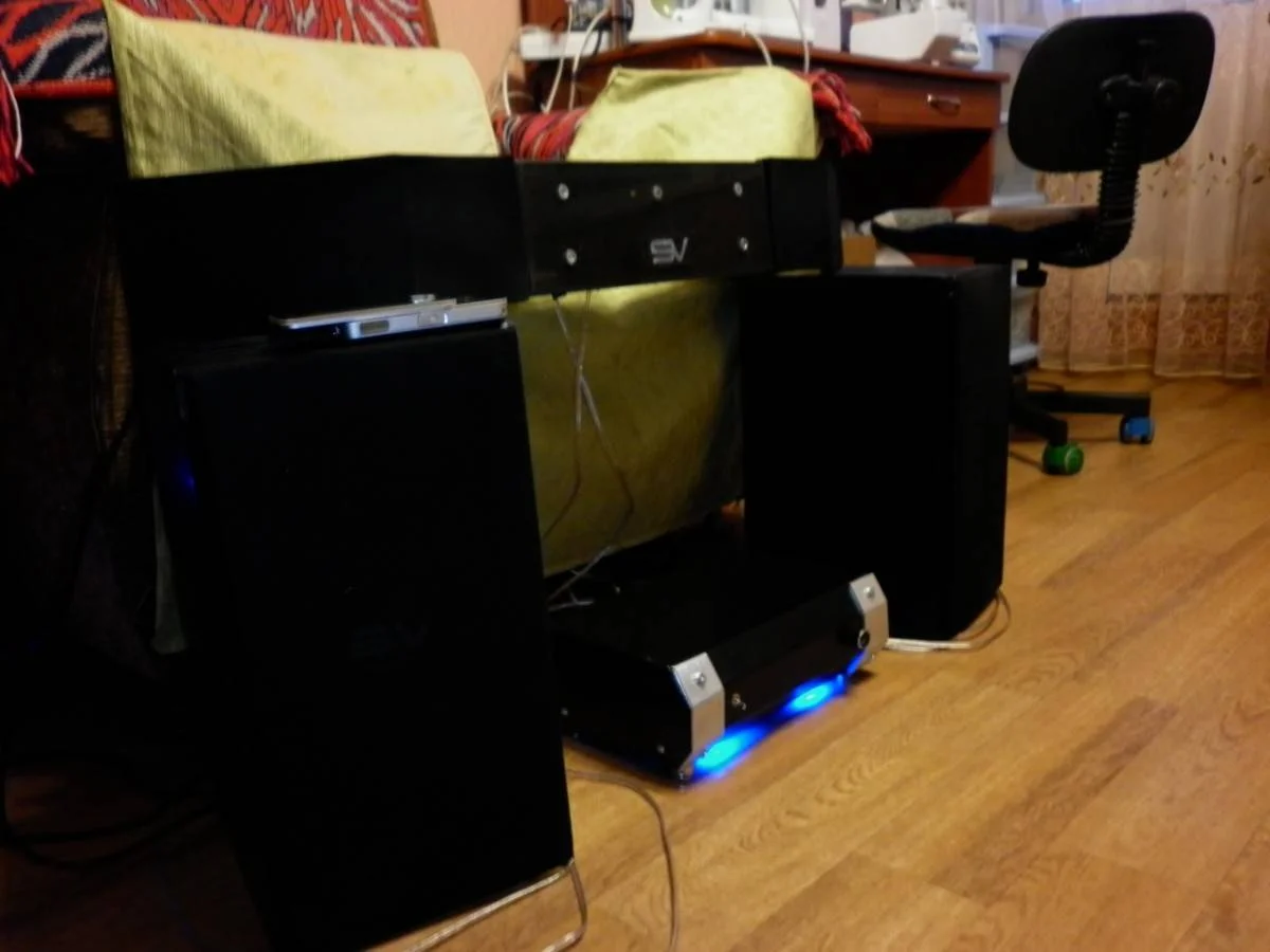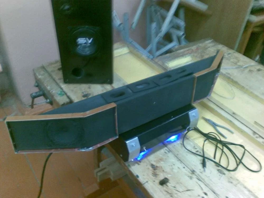 Несмотря на прекрасную 2,0 систему хотелось объема звука. Делать 5,1 систему? Нет,это слишком скушно. Представляю вам проектор пространственного звучания. 6 динамиков направленных в разные стороны- 2х тыл, 2х верх,2х низ. Это не просто обьем в горизонтали- это объем от пола до потолка! Раскачивает это чудо 3 усилителя SJ2025,но до этого звук обрабатывается 3 микрухами TDA3810,дабы увеличить стереопанораму. Корпус из фанеры 12мм, динамики- 2 советских,и 4 от каких то колонок,по 5вт. В добавок к этому звуковая карта 5,1. Пожалуй лучшее решение для фильмов и игр,особенно в сочетании со стерео очками.Оцениваем!