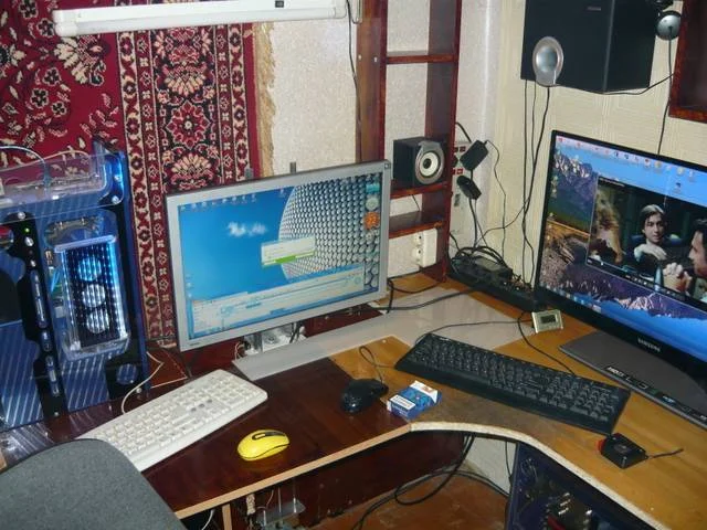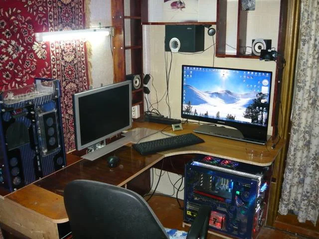 кстати есть софт - чтобы одной мышкой на 2х компах работать...курсор двигаешь и он на другой монитор как бы перебегает...так же как к одному компу 2 моника подцеплены...