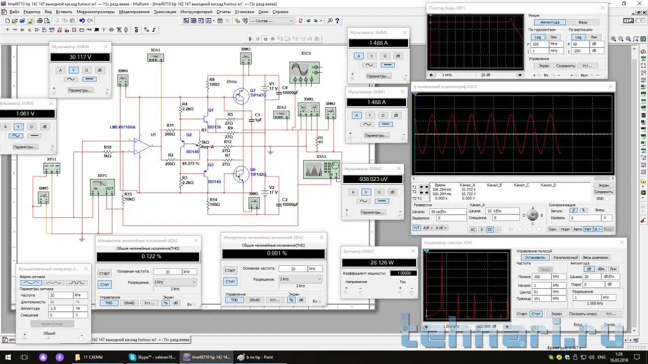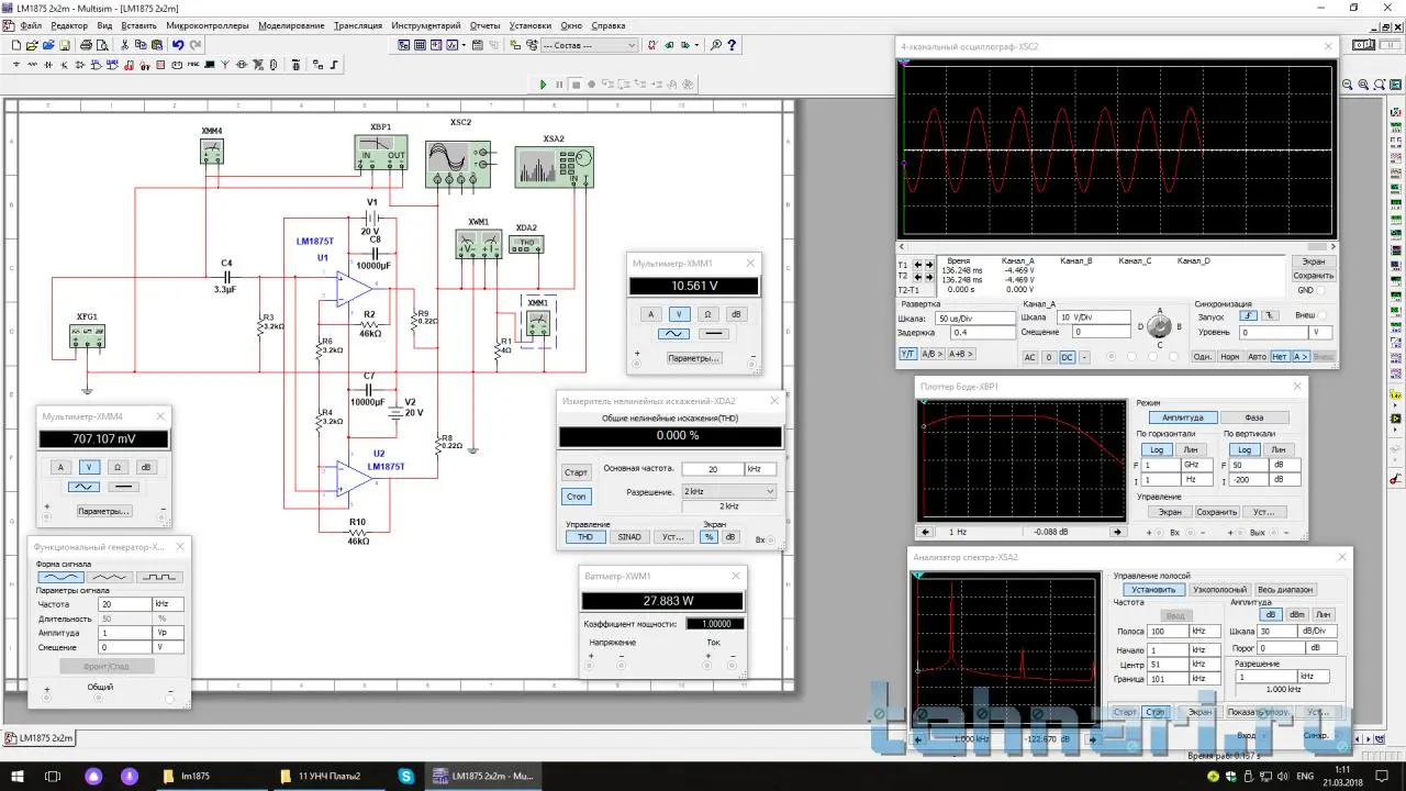 На сей раз реальное из моего, работает давно и надежно. Не секрет, что купить оригинальную ТДА2050 на гране фокуса. Это вариант когда покупаешь то, что дают под этим названием. Нужно было заставить работать на 4 омную нагрузку на гране возможного. На картинке симулятора стоят LM1875 за отсутствием модельки ТДА2050. Схема реальная.