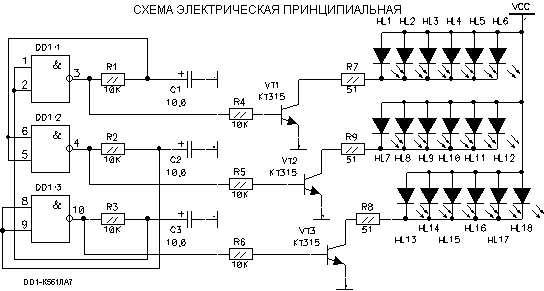 Трёхфазный мультивибратор можно собрать на микросхеме. Схема и печатка прилагаются.