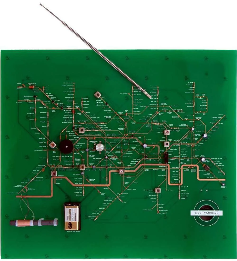Народ развлекается. Радиоприемник на плате, где дорожки нарисованы в виде карты Лондонского метро. Симпатично получилось. Японец делал