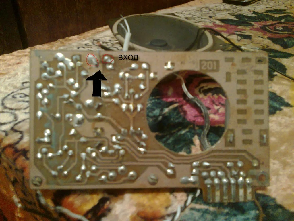 Если без регулятора громкости, то от движка этого регулятора (средний вывод переменного резистора) провод отпаяйте, этот провод и будет входом