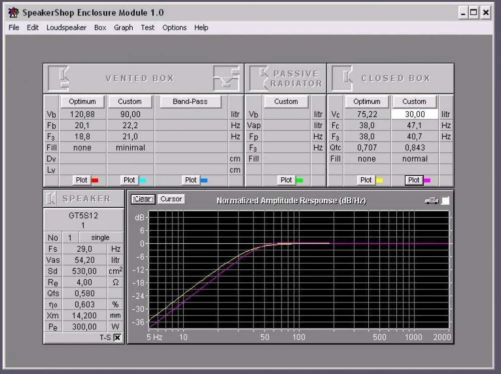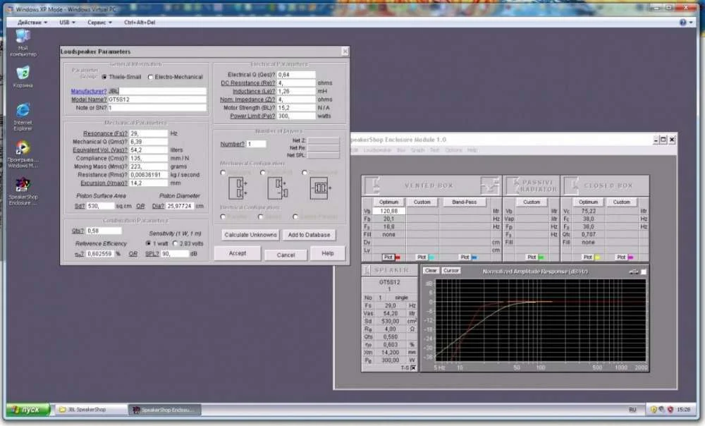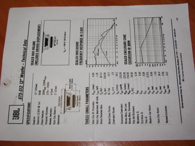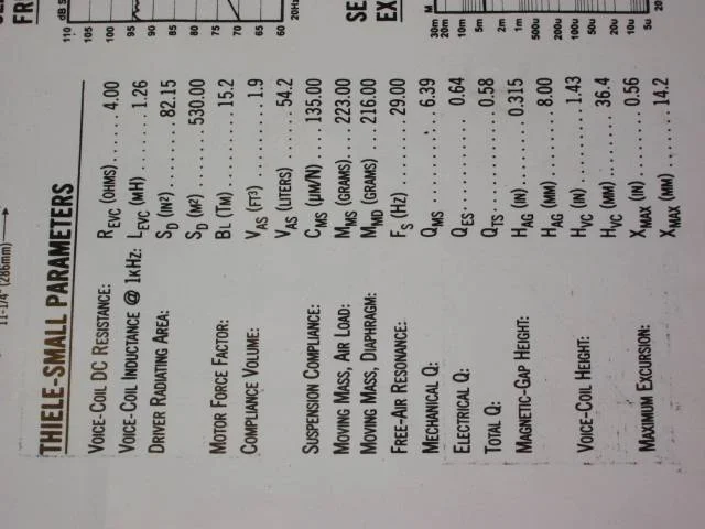 Помогите пожалуйста расчитать объем корпуса для динамика JBL 1200.Его данные на фото.установил программу SpeakerShop Enclosure Module 1.0 и чего-то в ней разобраться немогу.Никуда никаких данных не введешь,почему-то практически все кнопки главного окна неактивные.У кого есть установленные проги для расчета корпусов саббуферов помогите пожалуйста.У меня есть цилиндр диаметром 33см,хочу из него сделать корпус для саба.