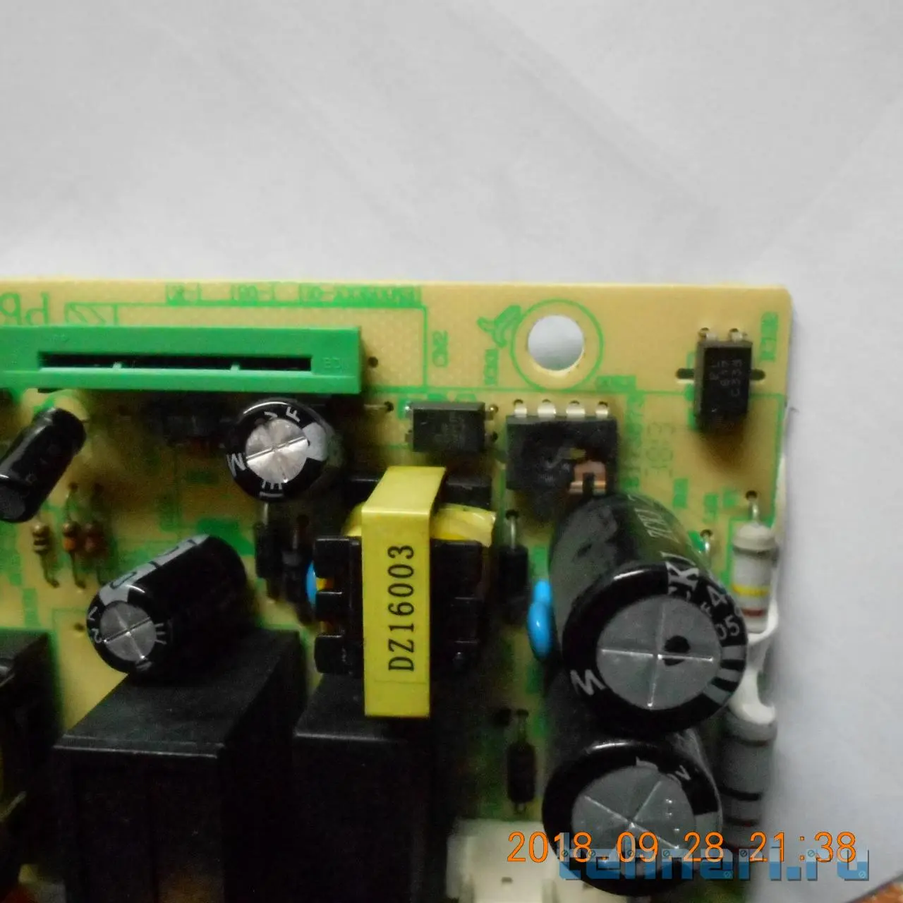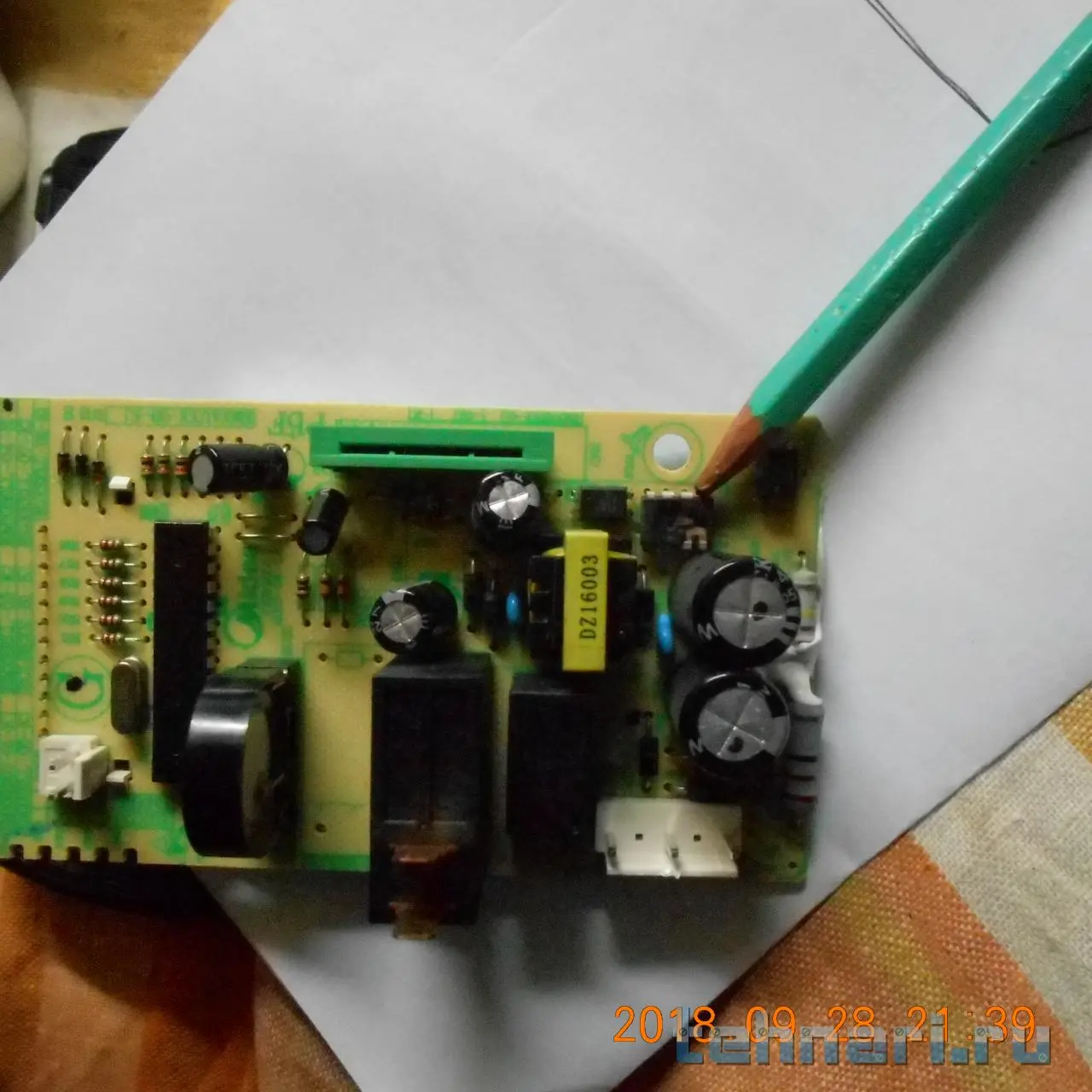 после разогревания очередного продукта в микроволновке РАNASONIK через 30мин. раздался сильный щелчок! никто не понял откуда звук. когда же решили подогреть ещё порцию продукта , то прибор молчал и не светилось табло. разобрал и на плате с дисплеем обнаружил визуально вышедшую из строя деталь! просто вырван кусрчек пластмассы из квадратной детальки. вот я сфотографировал и указал карандашом на это место. ВОПРОС - ЧТО ЗА ДЕТАЛЬ И КАКАЯ МАРКИРОВКА , если возможно определить ,конечно. или просто совет о дальнейшем действии. DSCN4853.webp