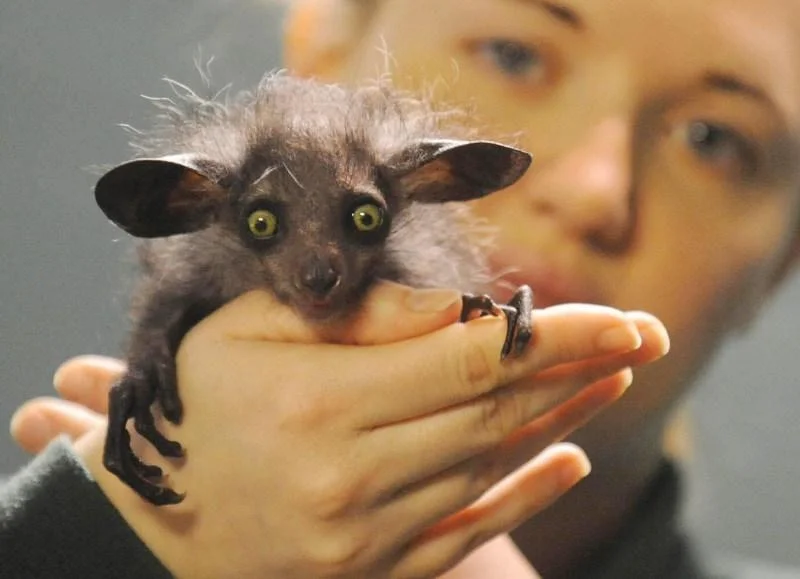 Это животное также имеет название мадагаскарской руконожки. Имеет продолговатое тельце с тонкими лапками, которыми цепляется за ветки деревьев. Столь неприятный внешний вид можно объяснить не очень красивой шерстью, которая топорщится на голове. С другой стороны, Ай-ай имеет какое-то очаровывающее обаяние и харизму. Пусть он и не красавец, но, наверняка, у него очень богатый внутренний мир.