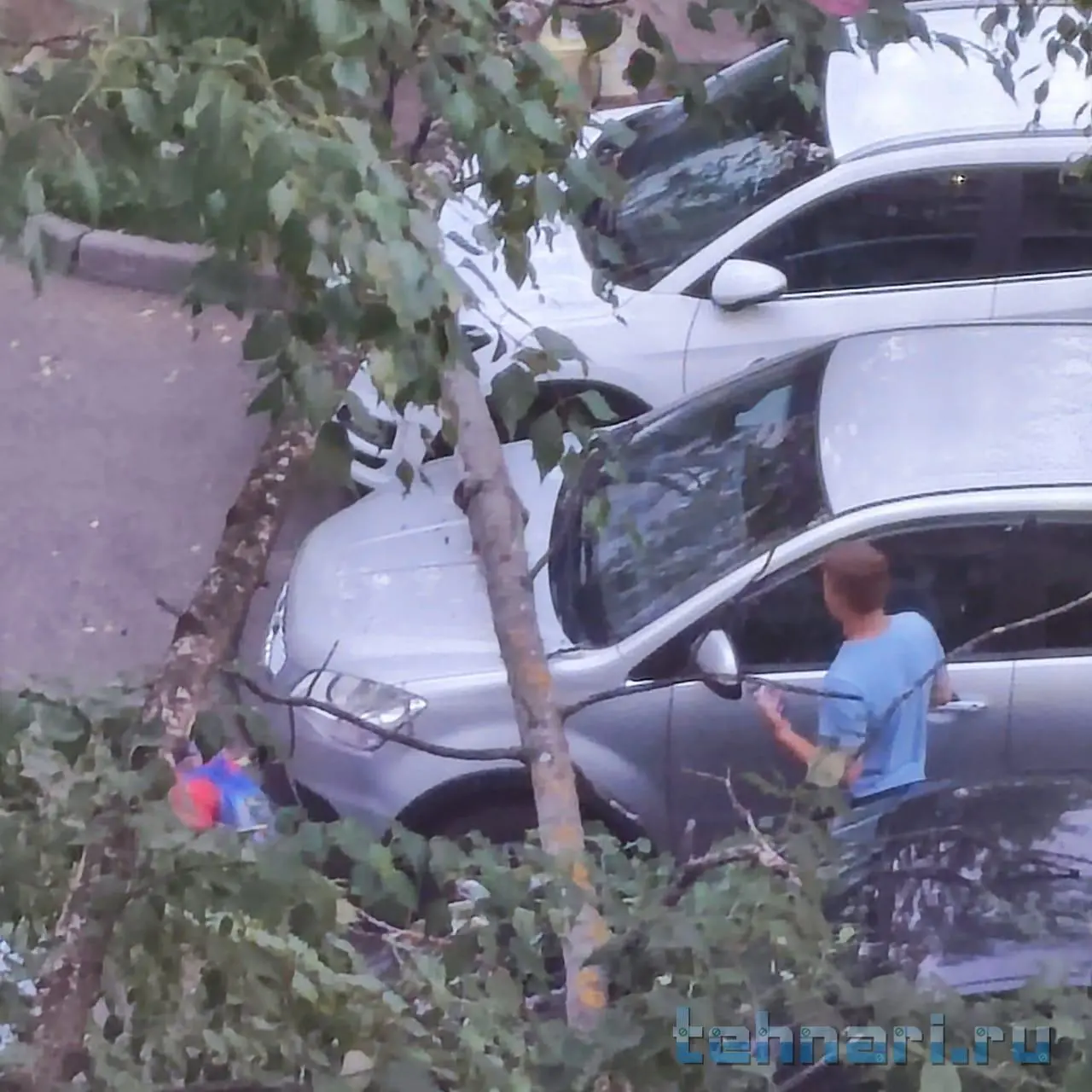 Уже давно стоит абсолютно безветренная погода, а три машинки "приласкало" абсолютно здоровым деревцем.