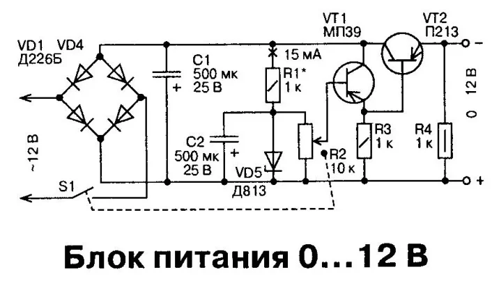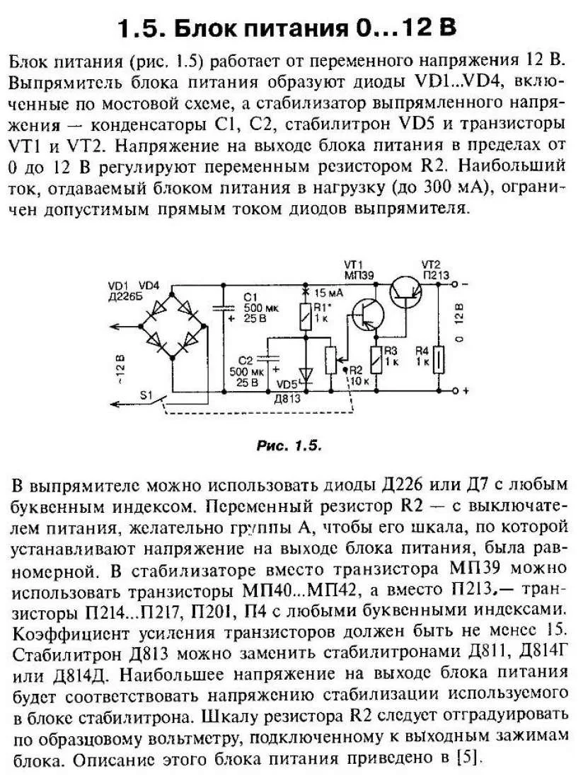 Господи, где Вы его откопали? Делал такой лет 35 назад. Очень прост и надежен. Кстати, если транзисторы заменить на современные то максимальный ток можно повысить в несколько разрегулируемый блок питания от 0-12 вольт