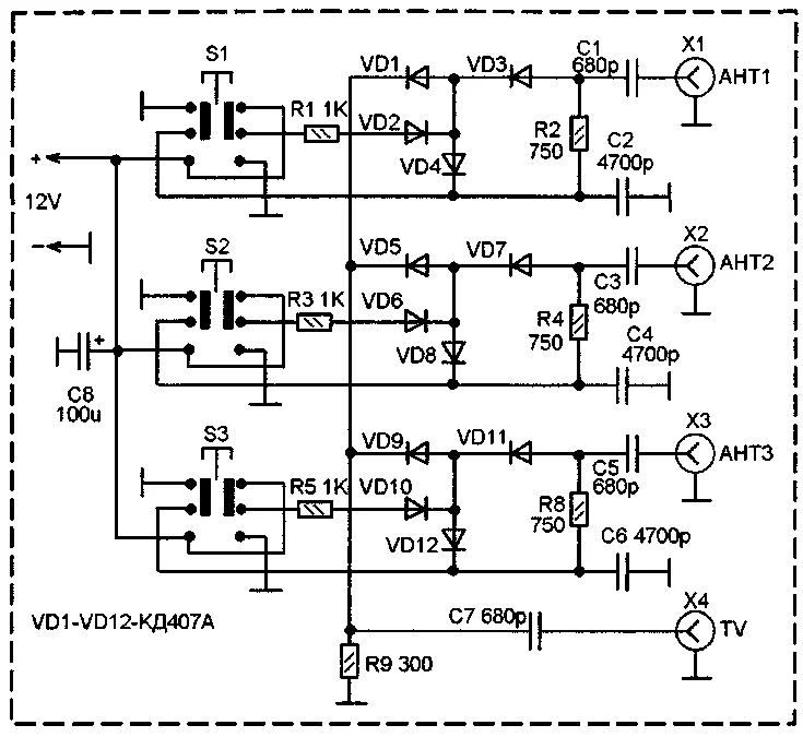 У меня в похожем переключателе (схема другая, но принцип тот же) с диодами КД409 было 3-4 дБ. Если повезет раздобыть p-i-n диоды, потери будут значительно меньше.