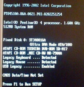 Ваще там всё так и настроено. Видите ли, я не понимаю почему он не пишет что-то типа "insert system disk" Т.е. загрузка с жесткого там стоит.. пробовал сидюк первым в очередь ставить, но ему походу параллельно. Вот дату с временем не трогал.. Над будет поковырять