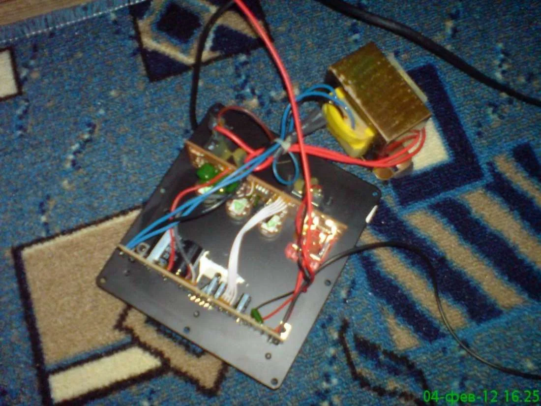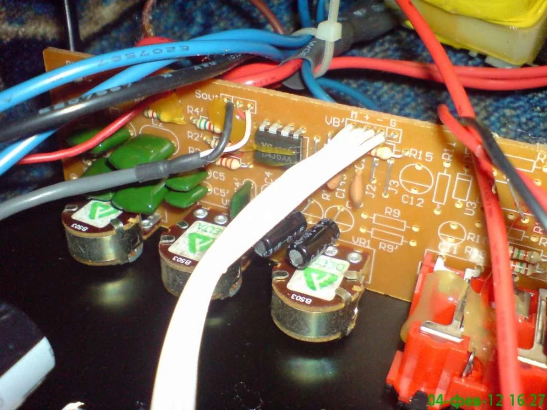 Далее УМ. Отпаять провода от платы регуляторов. Желательно впаять временные перемычки со входов на общий провод. Общий в данном случае - чёрный. Послушать в таком состоянии. Напряжение на выходе по отношению к общему проводу должно быть близко к нулю.