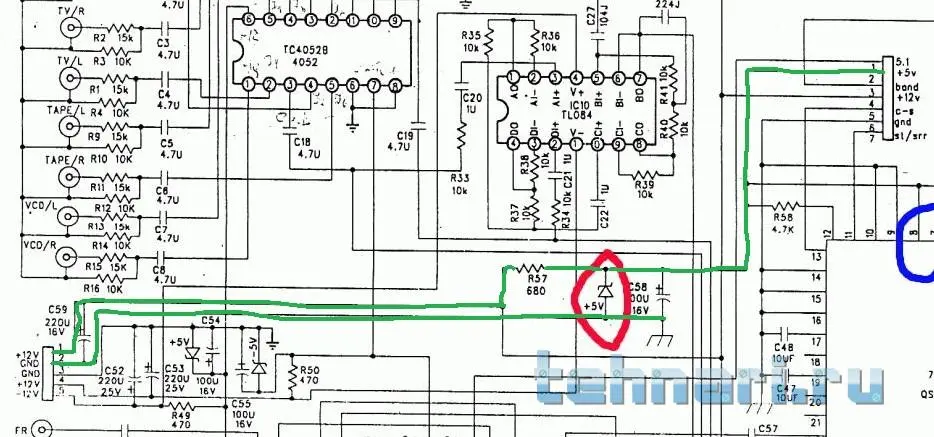 Вот здесь и берётся (смотри зелёненькую).Можете по схеме подсказать. А то я смотрю +12в заходит, а потом откуда то берётся +5в.