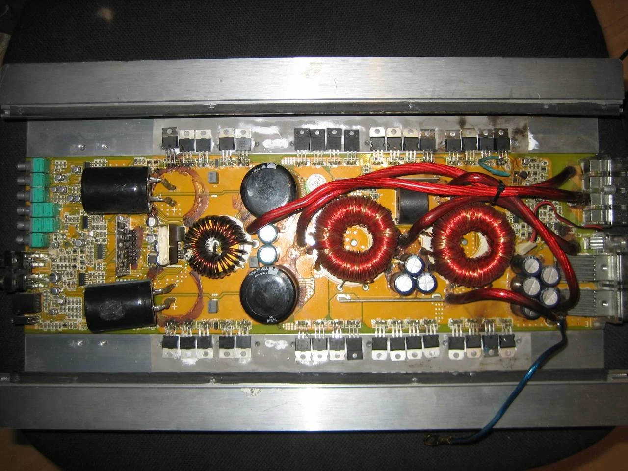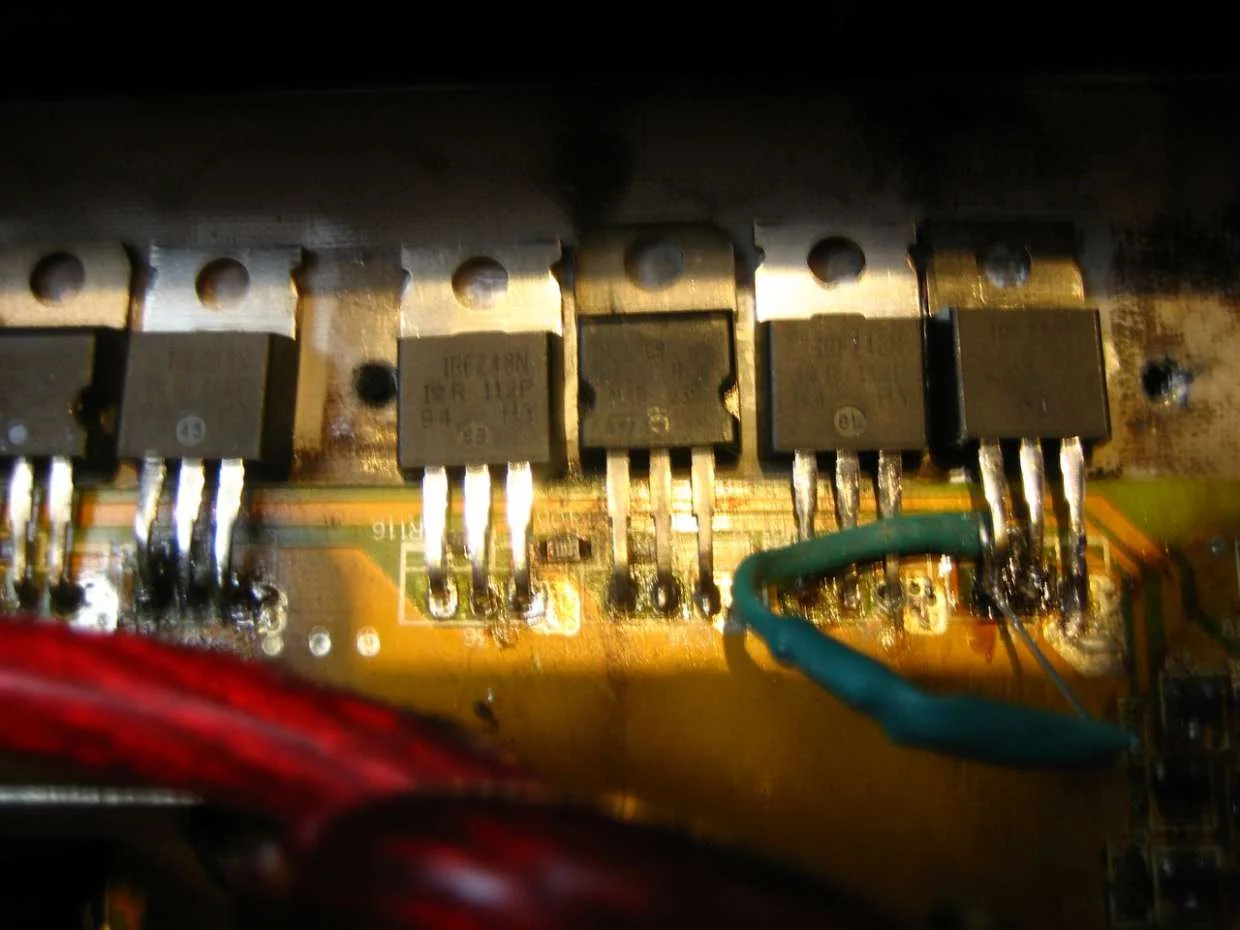 Всем доброго времени суток! Приобрел я данный усилитель с рук, как оказалось позже - усь ремонтировался. Менялись все транзы и пару кондеров. Возвращать уже не было смысла, работал хорошо. И вот в один день ушел в защиту. Сначала не понял в чем дело, при вынутом remote усилитель продолжал "работать", слышился какой-то бубнеж и запах горелого. Приехал в гараж, вскрыл, как оказалось сгорел один транз (весь обгорелый, потрескавшийся, искрил при подключении). Заменил 5 потрескавшихся транзов на аналогичные. Под самым сгоревшим оторвалось микро резистор с маркировкой 470. Заменил на обычный резистор на 47 Ом. Проблема в чем: при подключении только + и - начинает жутко искрить, + и - прозваниваются как при кз. Ток при этом переваливает за 10А. Не могу найти в чем причина.