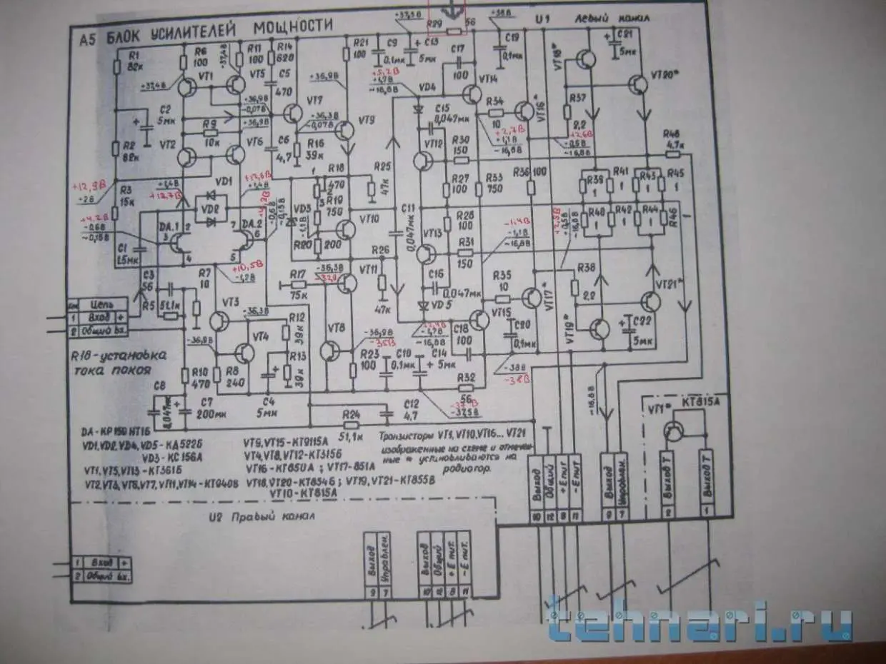 Всем привет. Есть у меня усилитель РАдиотехника У-7111, но не работает левый канал. В колонке просто гул, не зависящий от положения ручки РГ. Нашел схемуусилителя, померял напряжиния на контрольных точках, и вот что получилось. Можете пожалуйста подсказать, какие элементы проверять в первую очередь.IMG_3672.webp