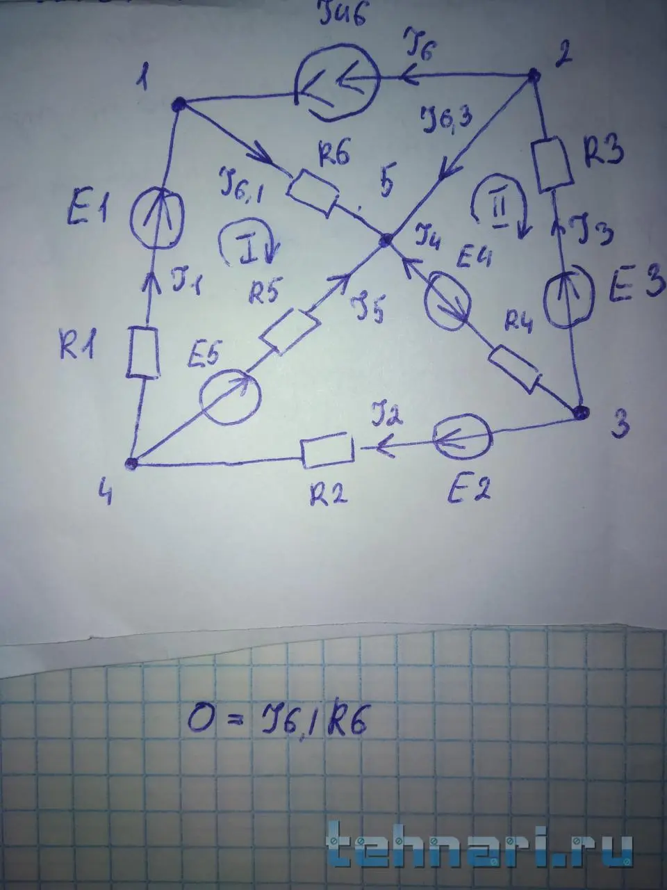Во-первых, нельзя уравнивать и складывать физические величины, имеющие разную размерность (это я про ток I6.3). Во-вторых, при чем тут ток? Мы же уравниваем падения напряжений. На идеальном проводнике, имеющем нулевое сопротивление, падение напряжения равно нулю. Так зачем оно там? И вообще, узел №2 и №5 - это одно и то же, мы его ввели исключительно для для нашего удобства зрительного восприятия схемы. В-третьих, падение напряжения на R4 д.б. положительным, т.к. направление обхода совпадает с направлением тока (заметьте, не ЭДС).