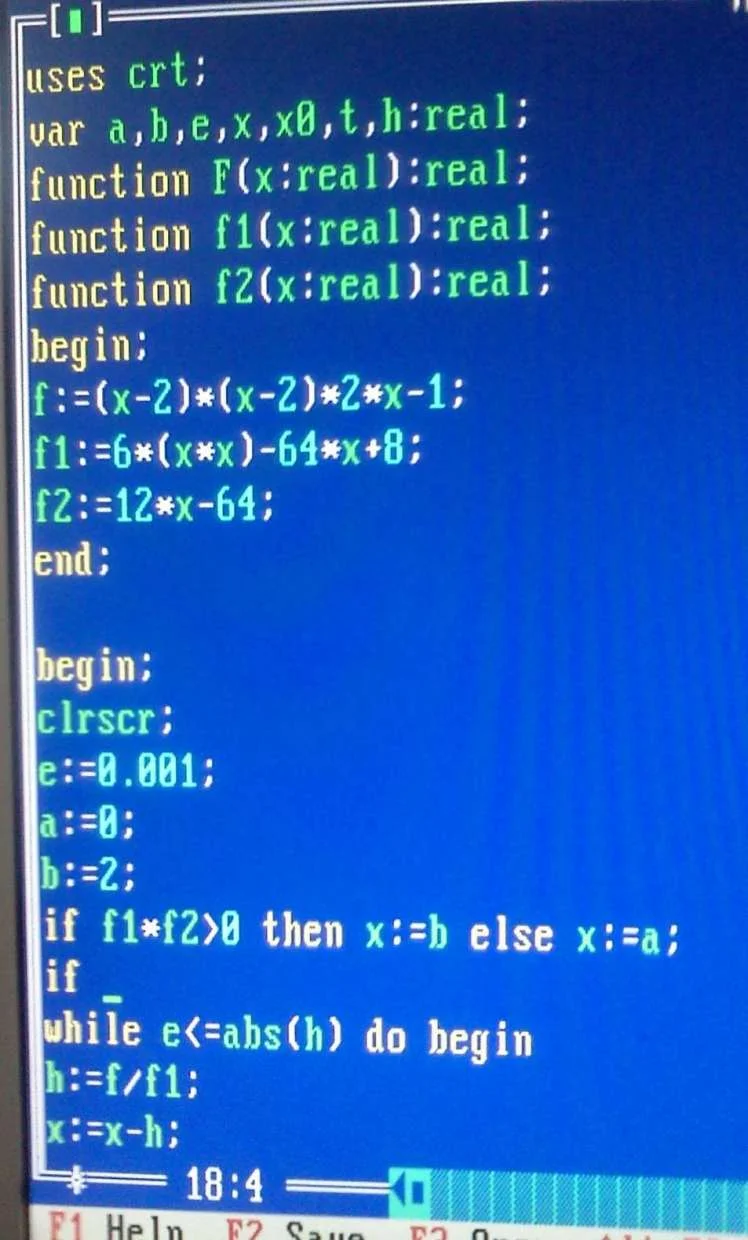 Извините,вроде все понял, но не могли бы объяснить один момент? в этой строчке Writeln('Result: x = ',x0_new:0:3); не понятно что такое x0_new:0:3. если не сложноможете пояснить?Не могу сказать, ибо хода не понимаю. Вы что, пытаетесь в одну программу оба метода засадить? Допустим. Но, во-первых, там F1 (первая производная) сосчитана неверно (откуда Вы взяли коэффициент 64? Должен быть 16), а во-вторых - ну на кой там вторая производная?