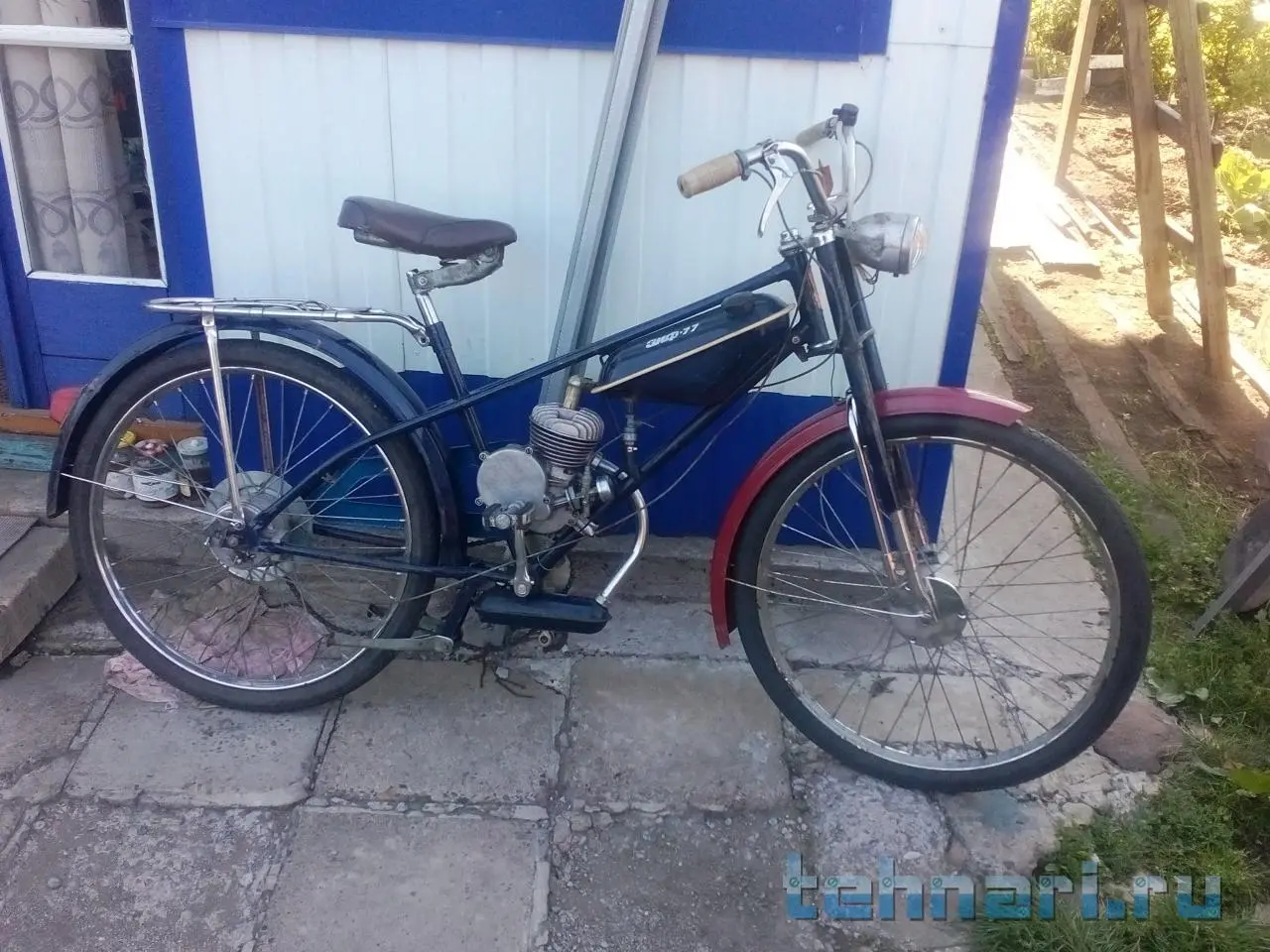 Крыло я покупал отдельно,родное до наших дней не сохранилось.На старых фотографиях можно увидеть ржавое крыло,оно зеленое.В будущем планирую перекрасить мопед в один цвет,наверно будет синим.