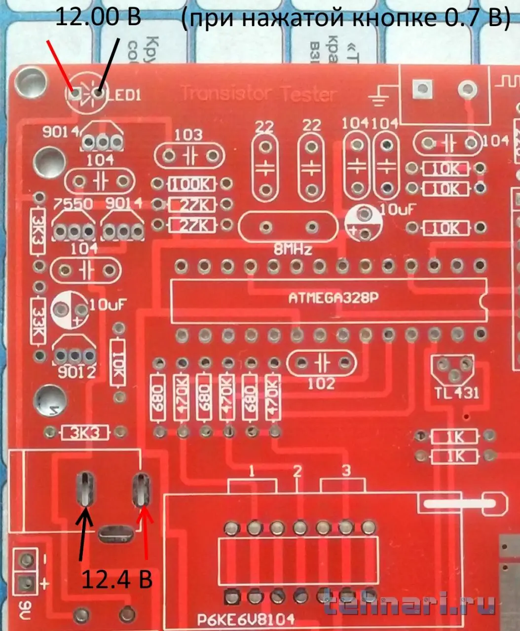А не чего страшного, что на нём показывает 12 Вольт? (или это из-за того что он впаян неверно?Светодиод - выпаивать и менять местами выводы.